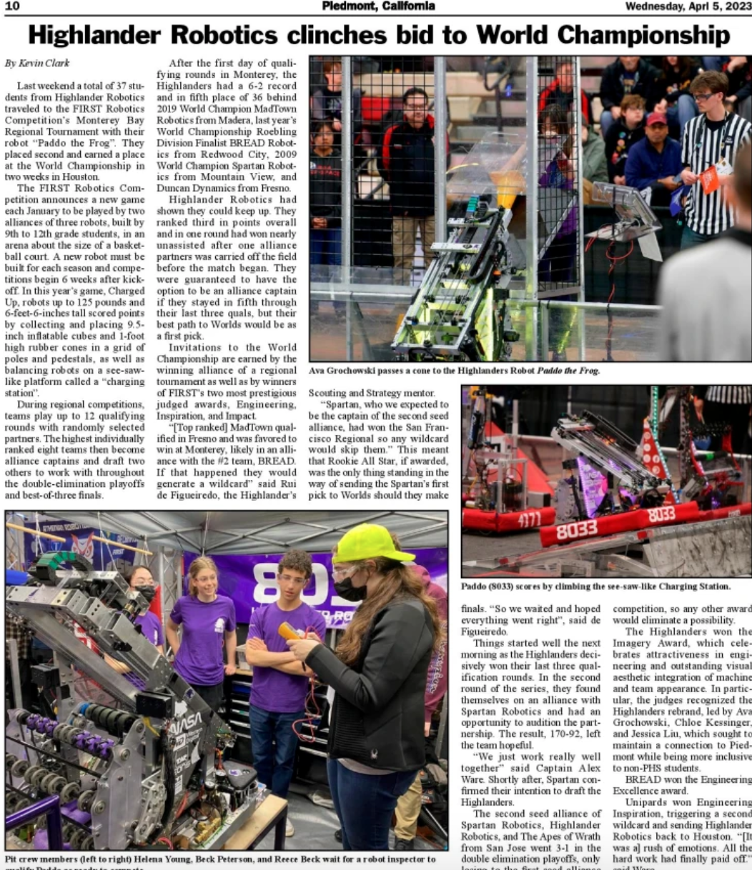 2019-2022 We regularly write articles in our local papers, the Piedmont Post, and the Exedra, which is a local news website. Our team members continue to serve as mentors to local FTC and FLL teams.